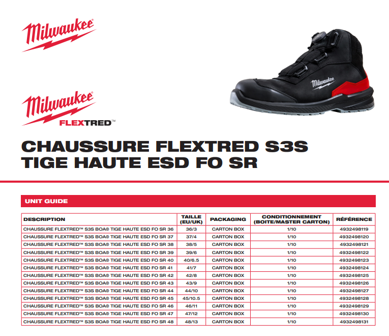 Chaussure de sécurité ESD haute - FXT S3S BOA FO SR FLEXTRED - MILWAUKEE - Tailles 36 à 48